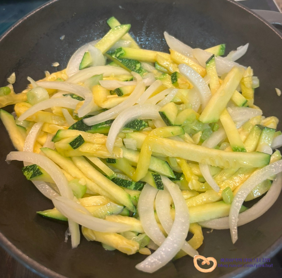 채 썬 애호박과 양파를 넣어 2분간 볶아주세요. 양파와 애호박은 볶는 과정에서 채소 본연의 단맛이 더 올라오게 돼요.
