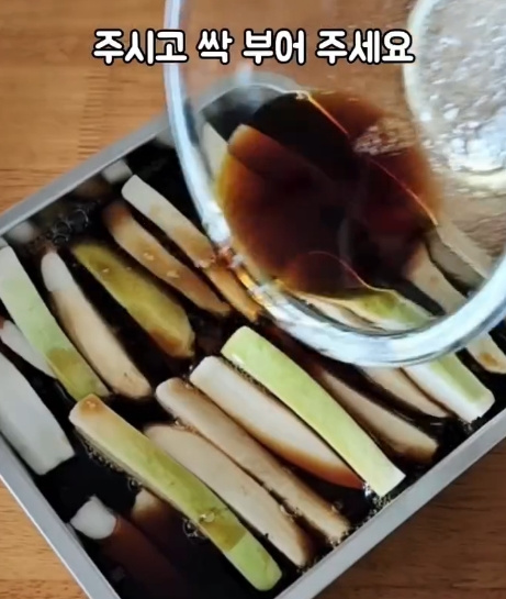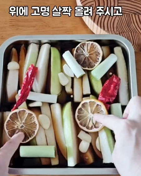 이번에는 작은 무를 살짝 꾸덕하게 말려, 절임물만 부어도 다음날 바로 먹을 수 있는 ‘아삭꾸덕 무장아찌’를 만들었어요.