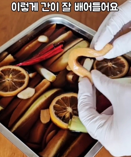 겉은 꾸덕하고 속은 촉촉하게 말린 무는 절임물에 들어가도 물러지지 않고, 감칠맛도 깊게 배어 정말 맛있답니다.