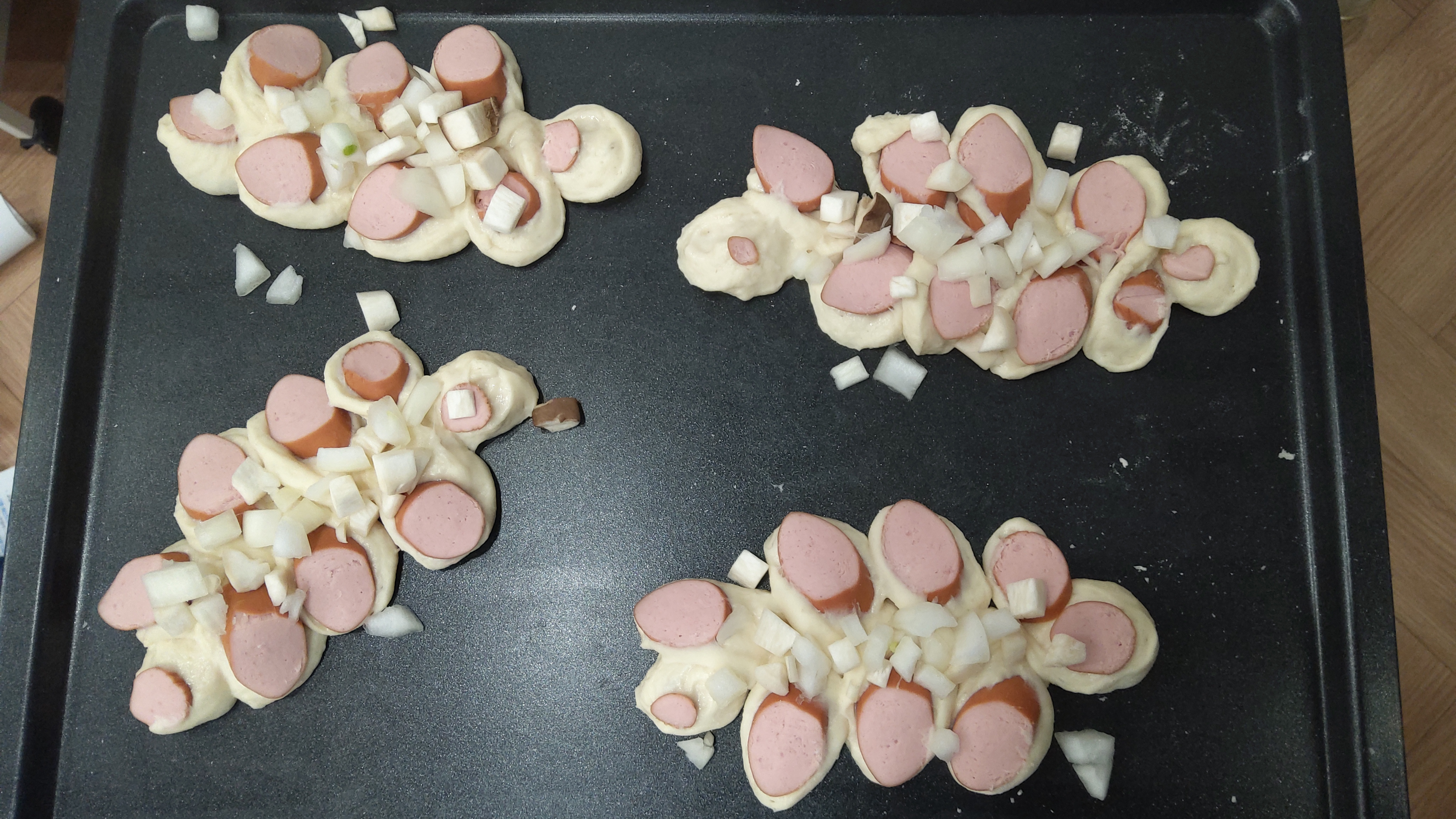 만든 소세지빵. 반죽기볼 설거지도 귀찮아서 걍 무반죽법으로 했다는...