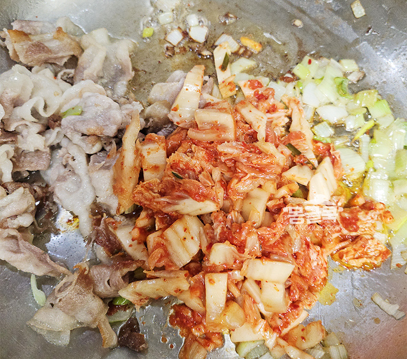 그다음 김치와 잘 섞어 함께 볶아주세요.