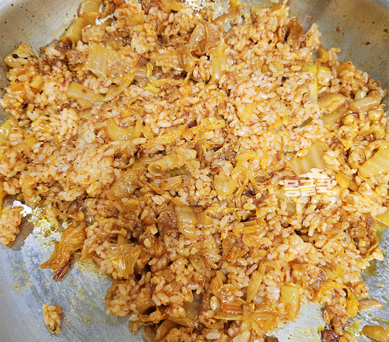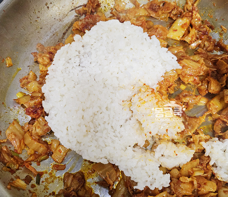 불을 잠시 끄거나 약불로 줄인 상태에서 찬밥을 넣어주세요.
