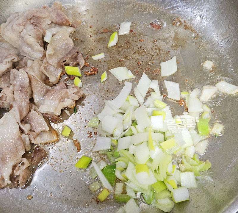 팬에 남은 고깃기름에 썰어둔 대파를 넣고 중불에서 노릇하게 볶아 파기름을 먼저 내주세요.
