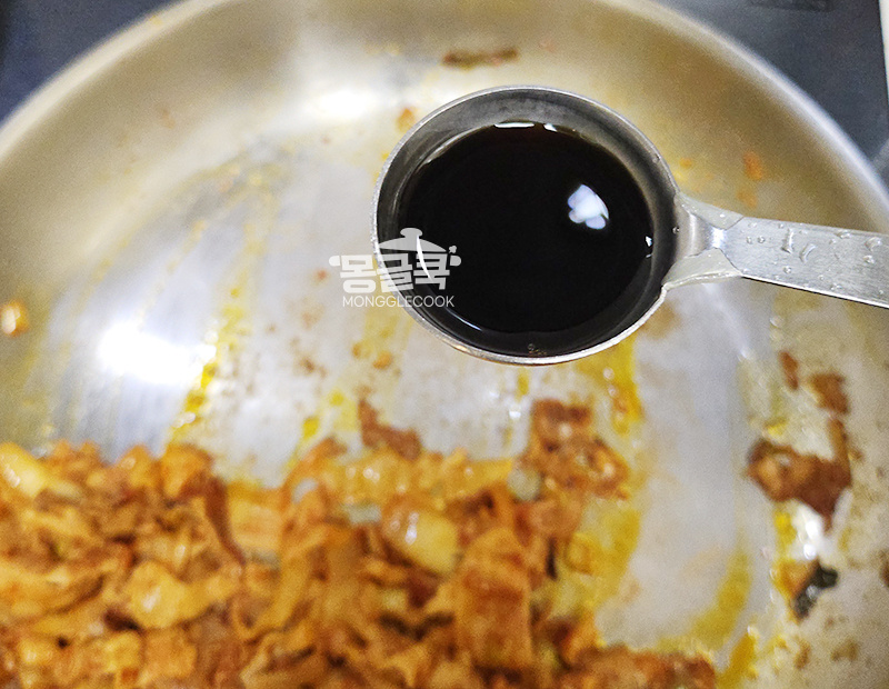 팬 한쪽을 비워 진간장을 넣고 10초 정도 살짝 태우듯 끓여 불 맛을 내주세요.