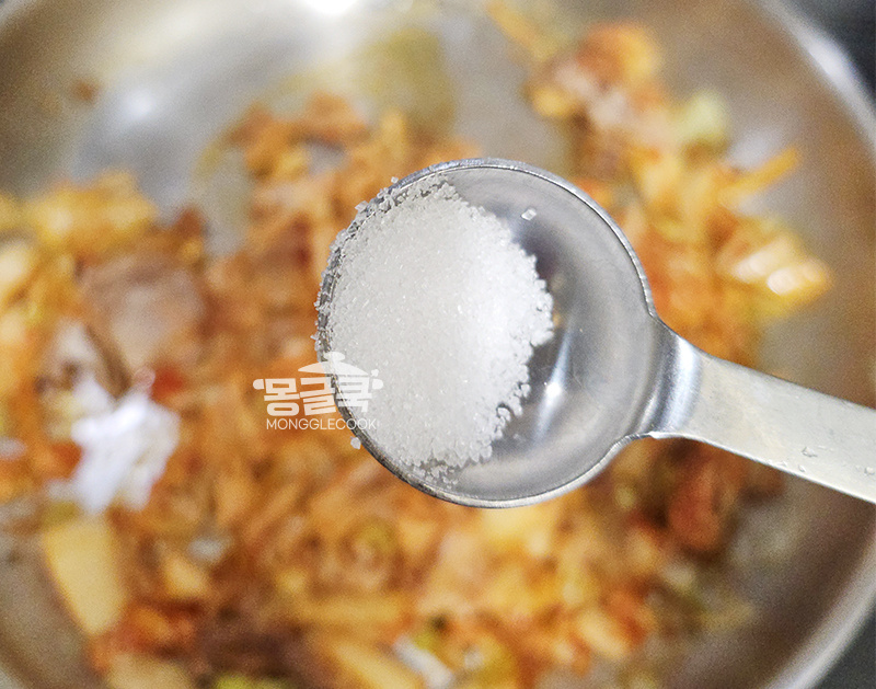 여기에 김치와 설탕을 넣고 김치가 나른해질 때까지 2~3분 정도 볶아주세요.