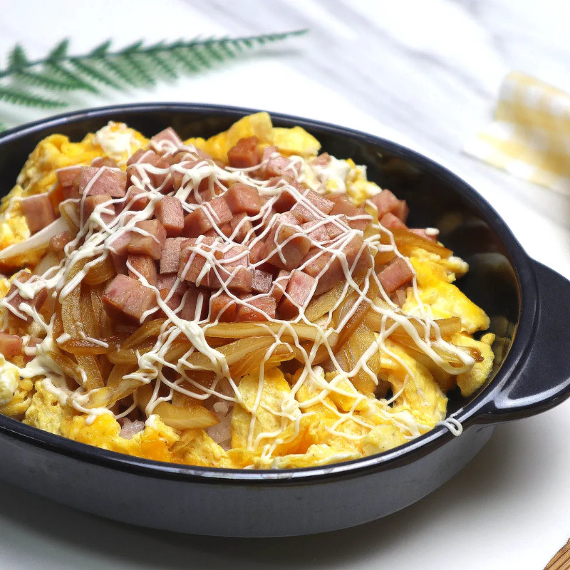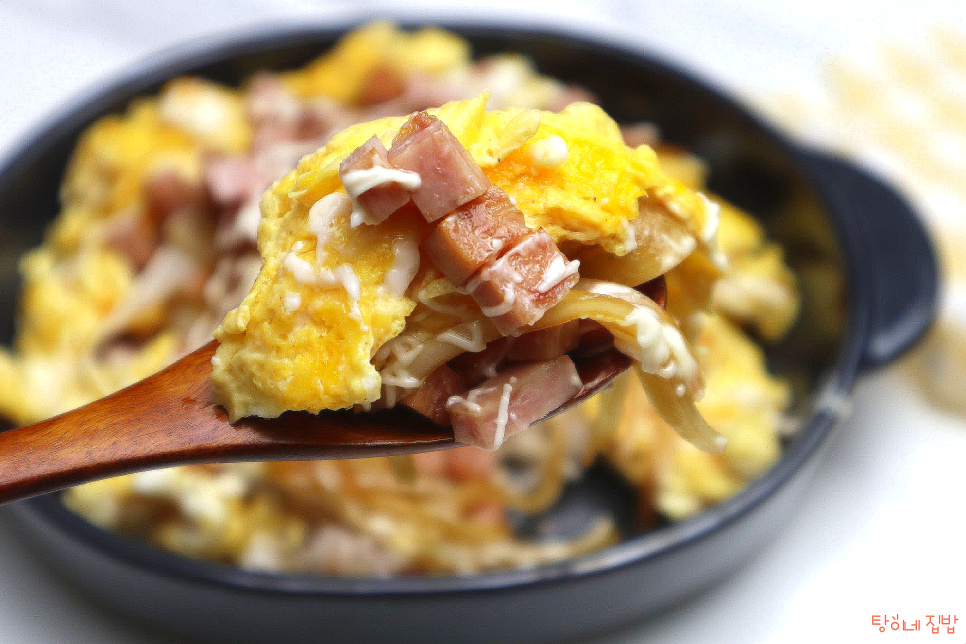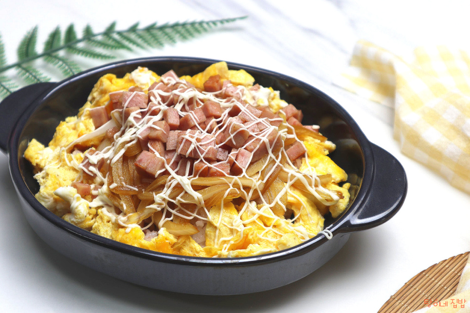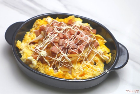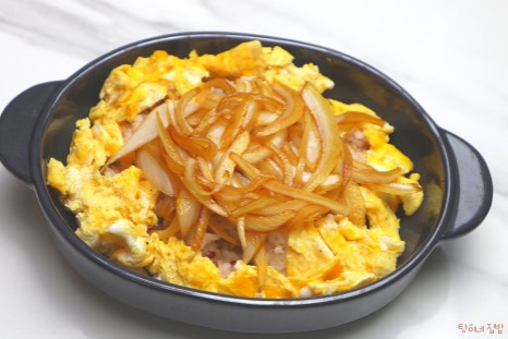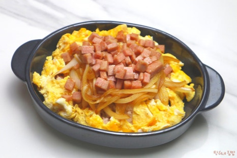스크램블 계란 → 졸인 양파 → 구운 스팸 순으로 올려주세요.