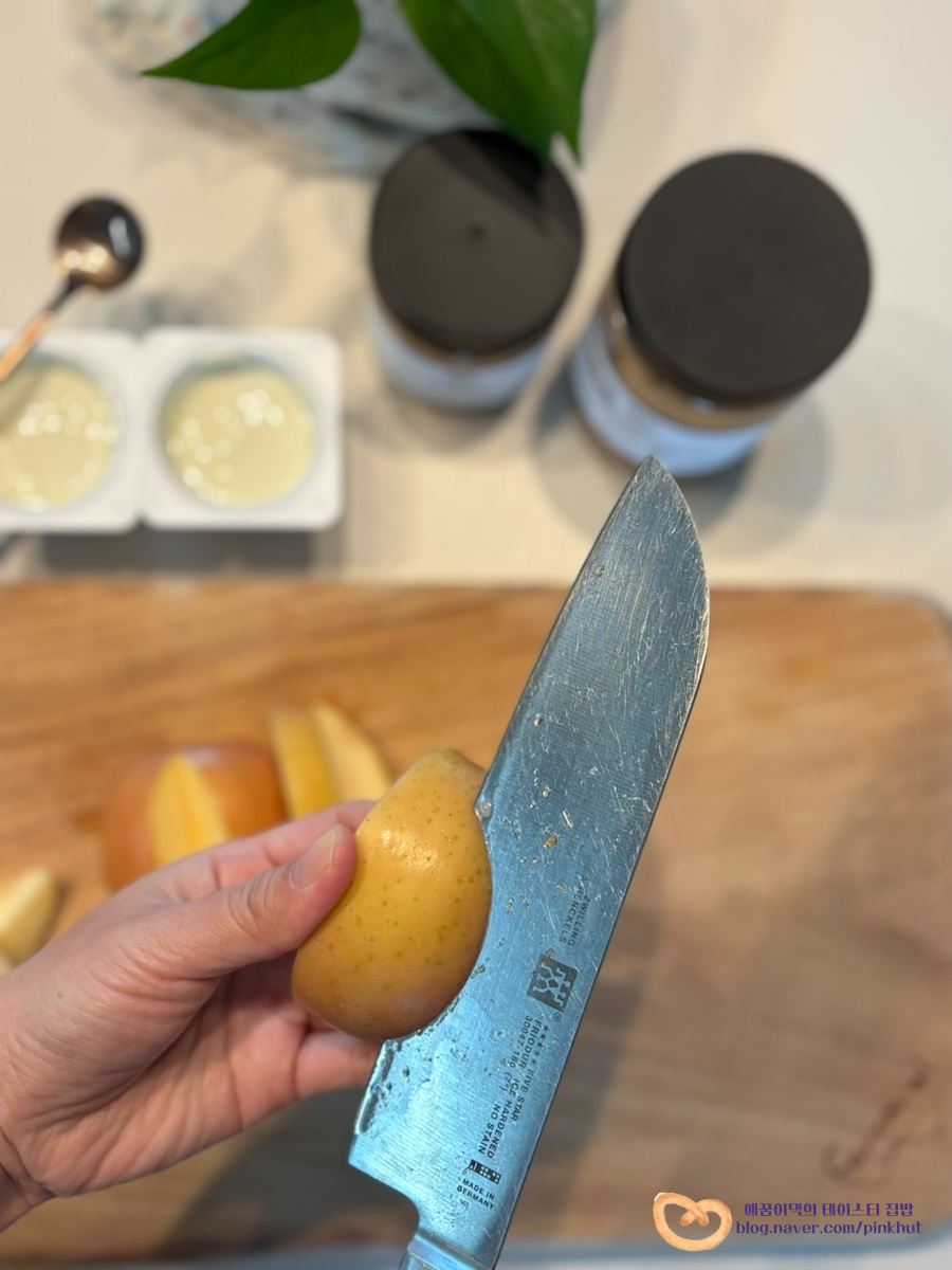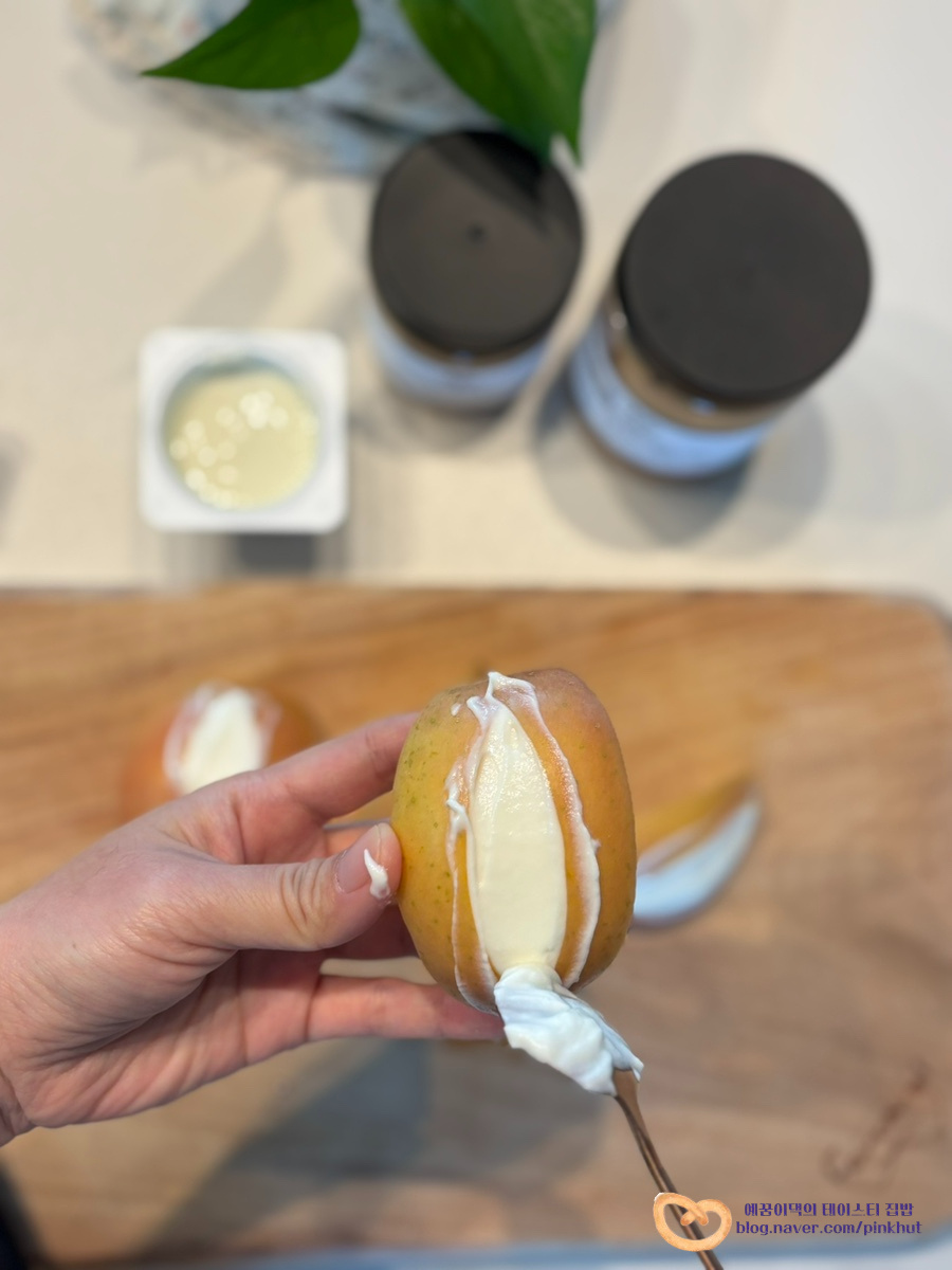 그릭사과는 그릭모모 만들기 처럼 요거트를 채워 만드는 점이 비슷한데요, 단단한 사과의 질감 덕분에 그릭복숭아보다 더 쉽게 만들 수 있어요.