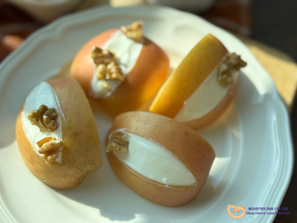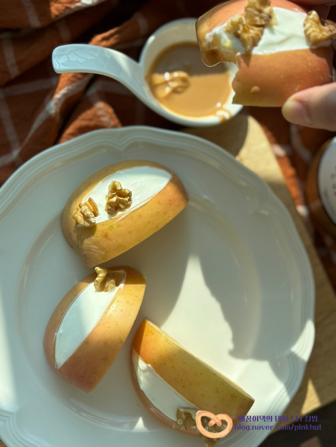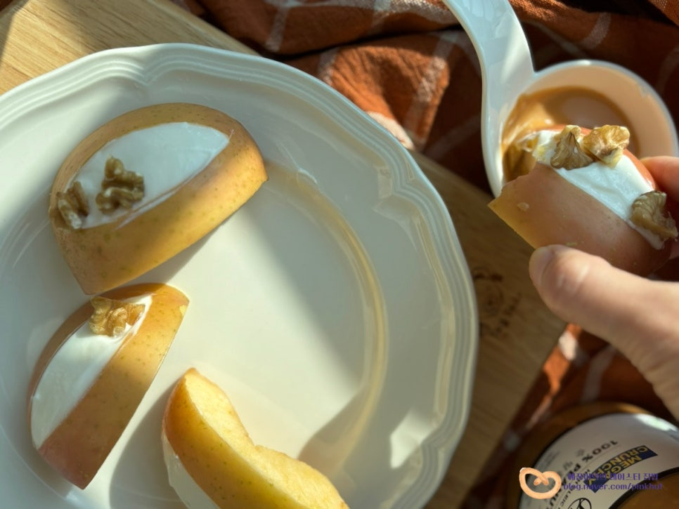 그냥 먹어도 좋은데 고소한 땅콩버터에 푹 찍어 먹으면 맛과 풍미가 확~ 맛도 최고랍니다! 이번 사과요리 꿀조합 사과 그릭요거트 땅콩버터 꼭 한번 만들어 보시길 추천해요.