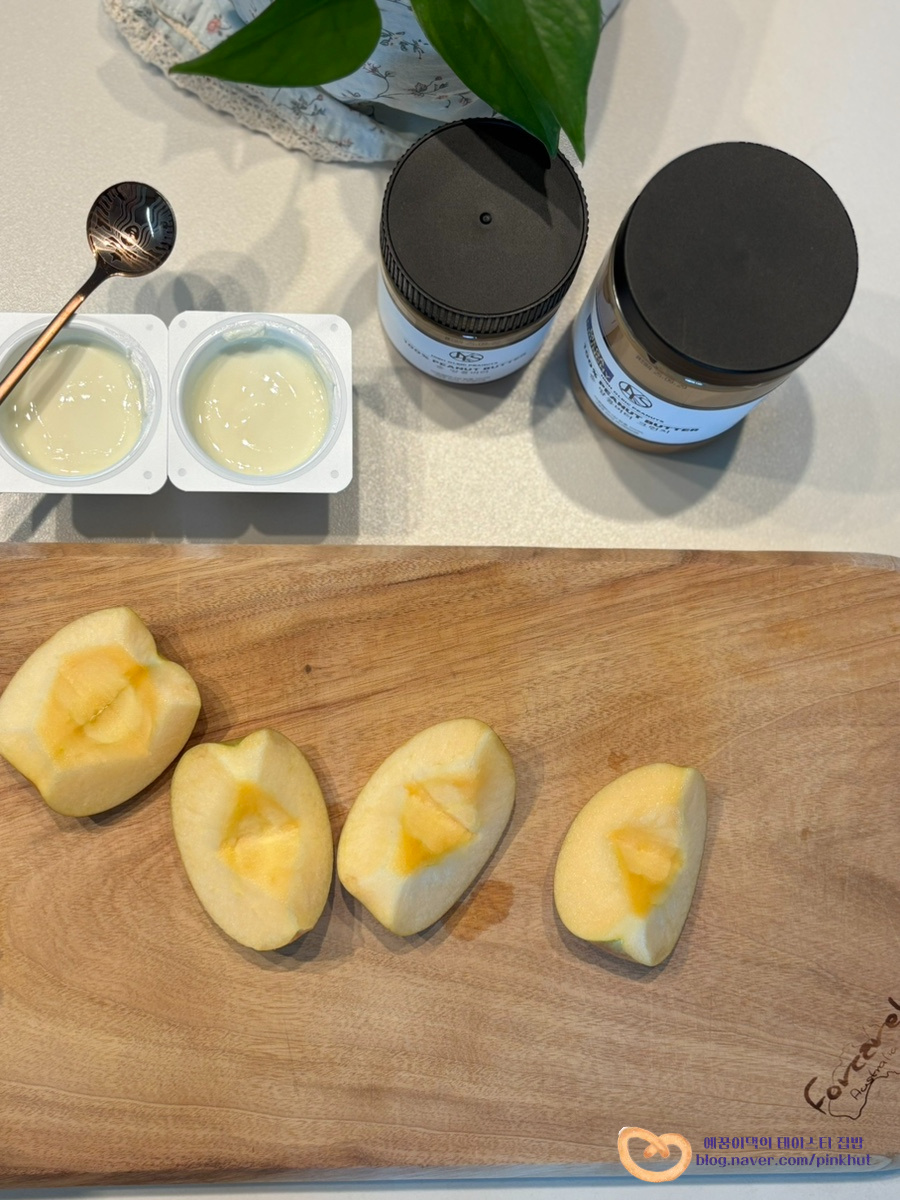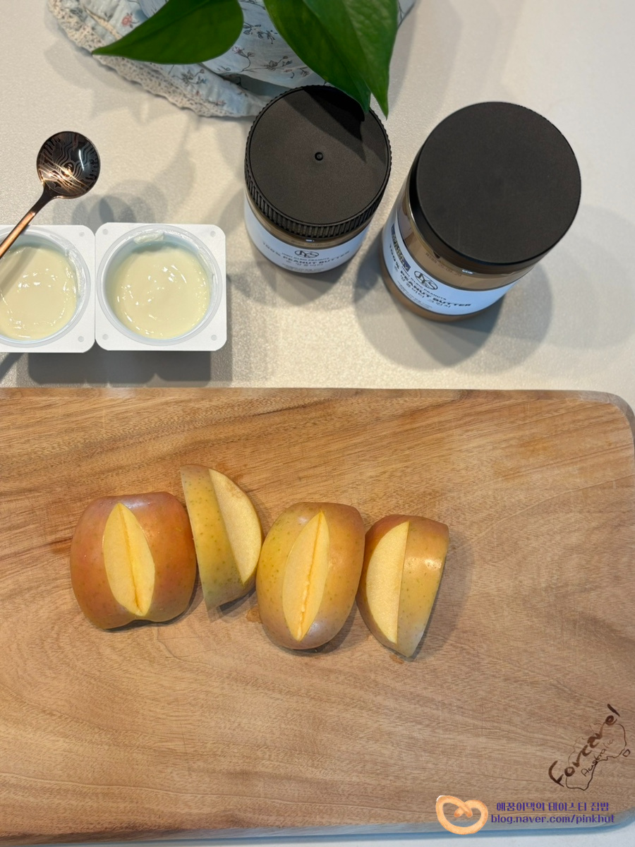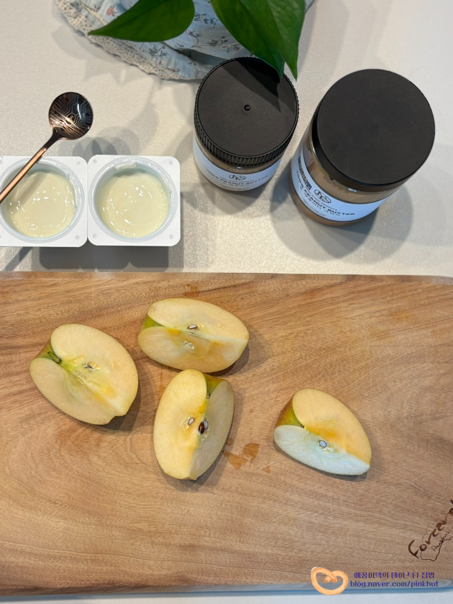 요즘 핫한 그릭사과에 땅콩버터를 꼭 곁들여 보세요. 비주얼과 맛이 미쳤다고 표현할 수밖에 없어요 >