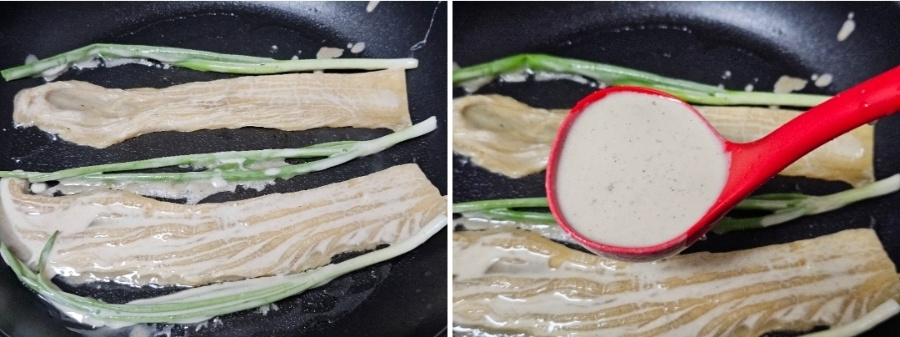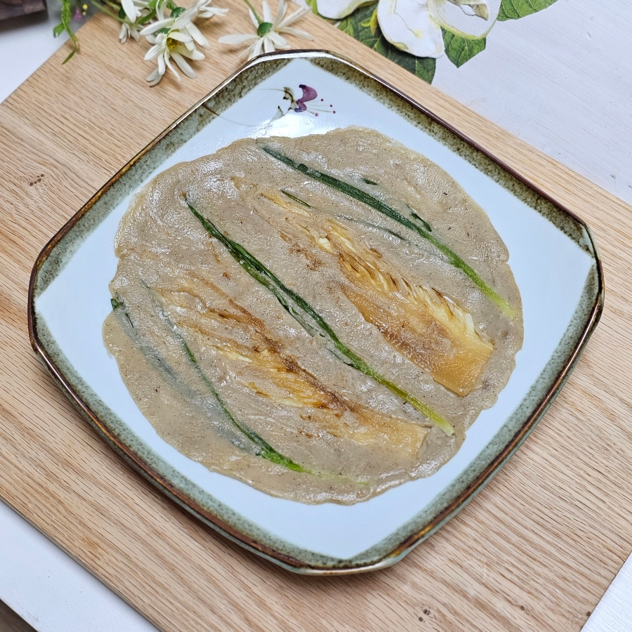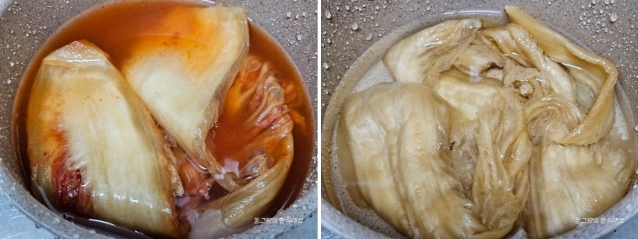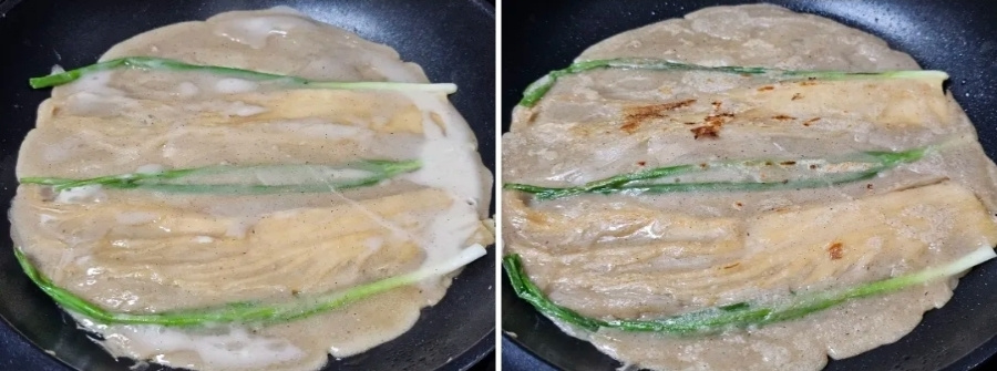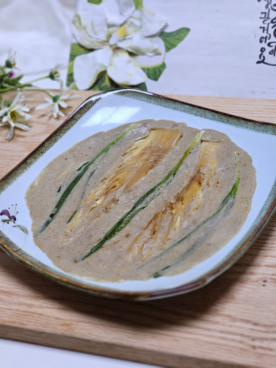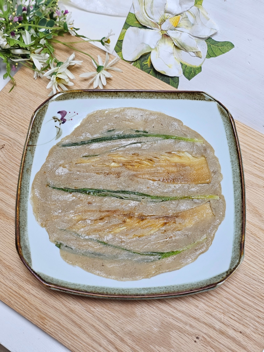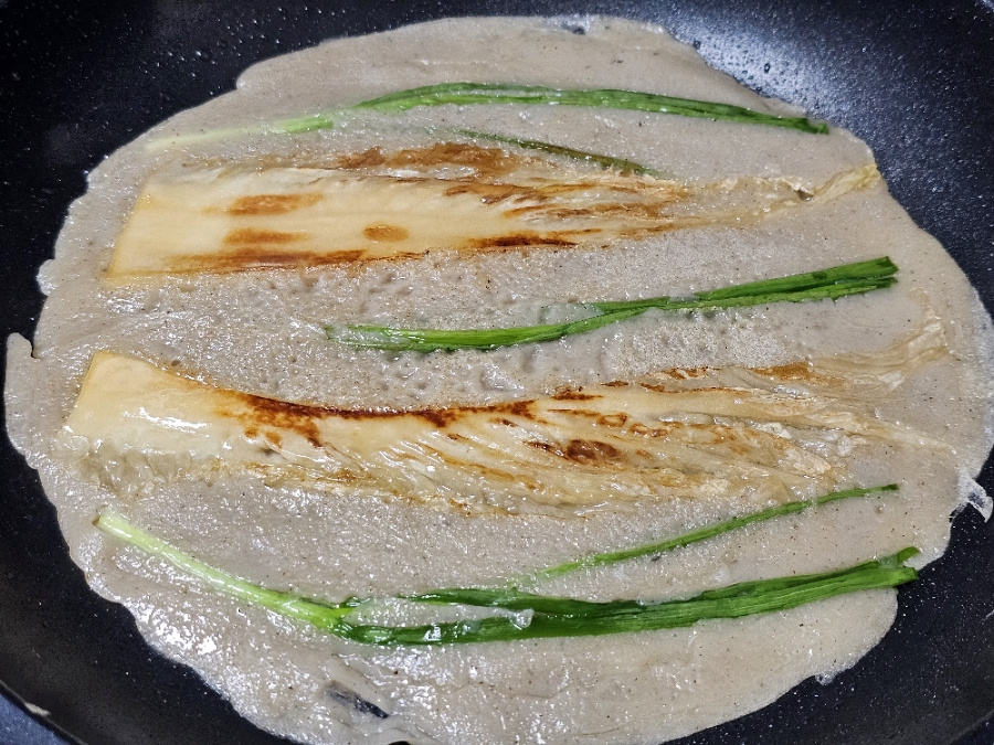 반죽 물 묻혀 부친거나 김치와 쪽파를 먼저 놓고 부친 거랑 비슷한데요. 반죽 물을 살짝 묻히니 김치에도 반죽이 묻어서 더 매끈하게 잘 부쳐지는 것 같아요.