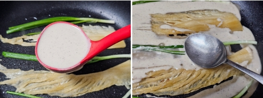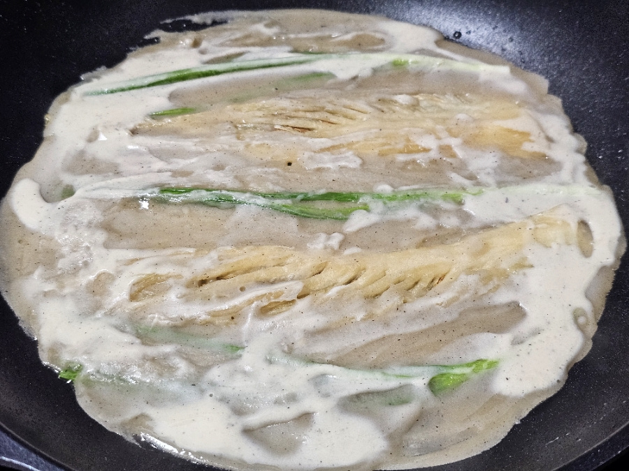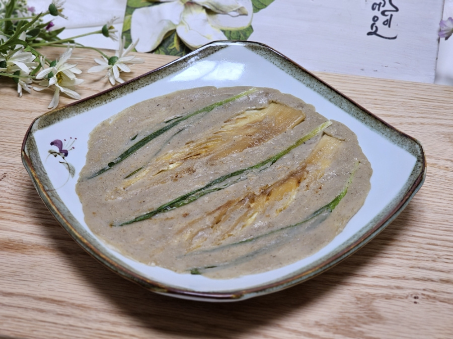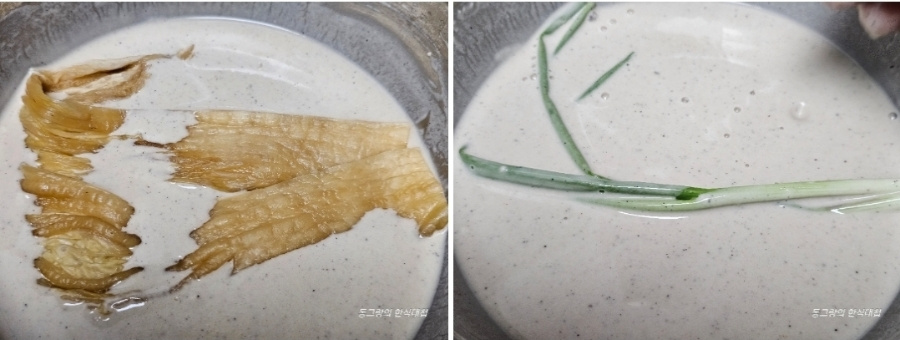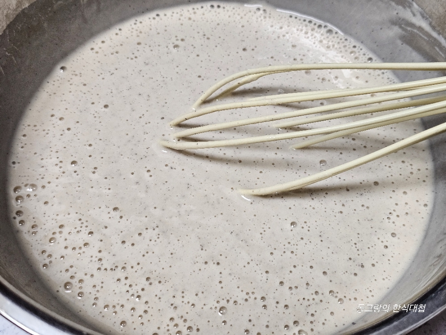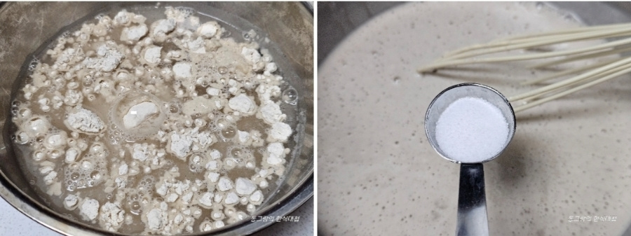 제품 설명서에는 가루 1 컵에 물을 2 컵 부으라고 써 놓았는데 너무 묽은 것 같아서 저는 반 컵 줄였어요. 섞어 보시고 농도 조절하세요