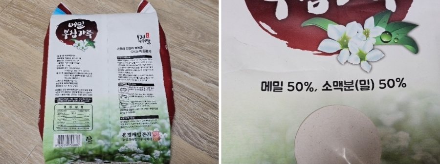 전으로 부칠 거라면 메밀 함량이 높은 것보다 밀가루가 적당히 섞인 게 찢어지지 않고 잘 된답니다. 사 먹은 전은 찢어지지 않고 깨끗했는데 상인분 말씀이 식당에서는 30%짜리를 쓴다고 하네요.