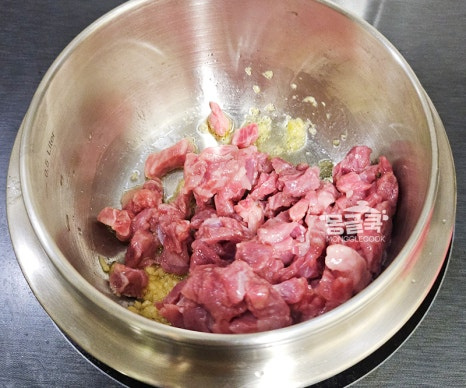 마늘 향이 밴 기름에 밑간한 양지를 넣어