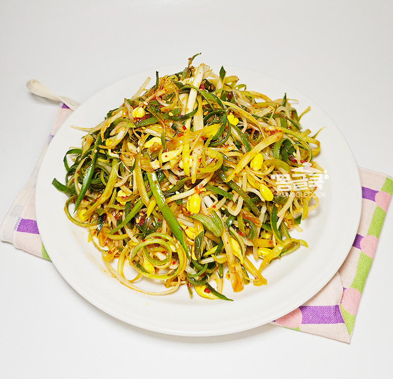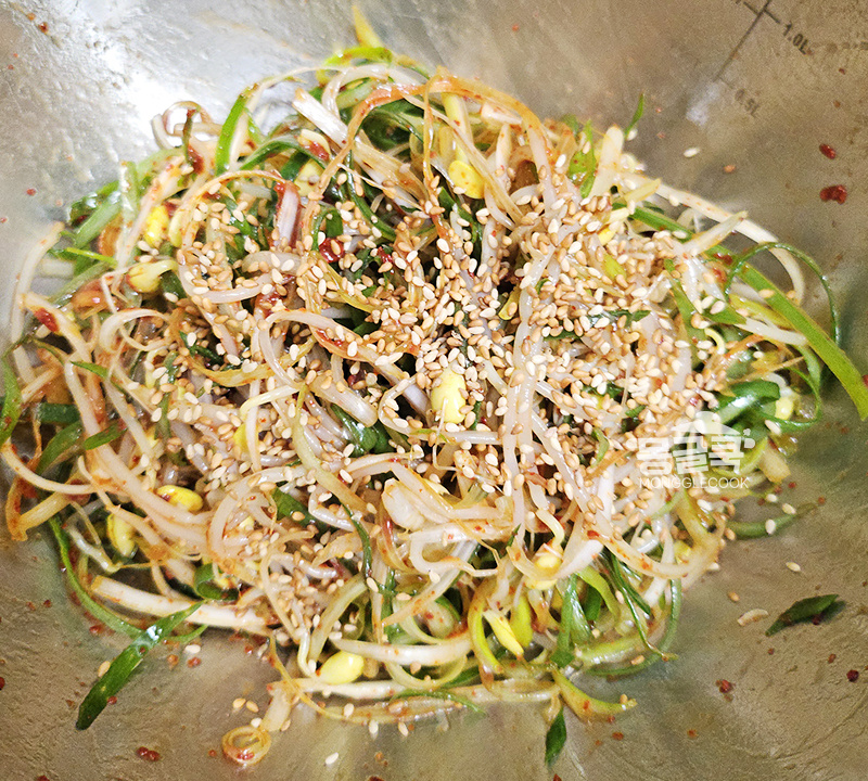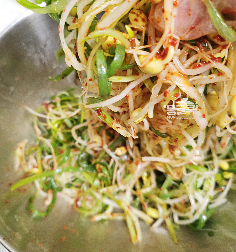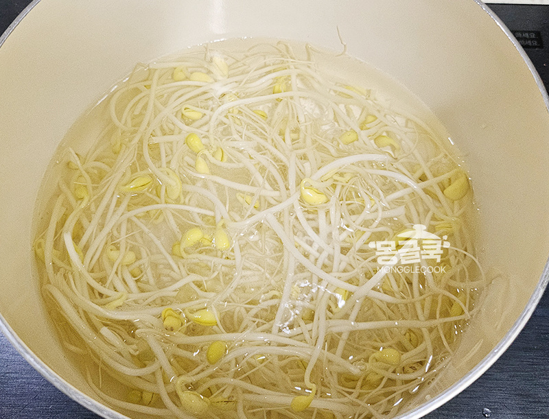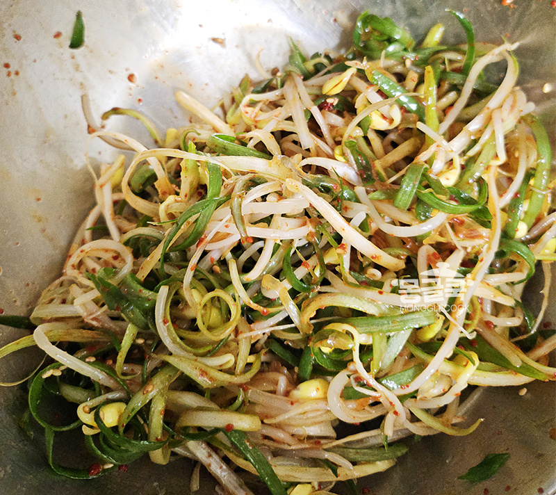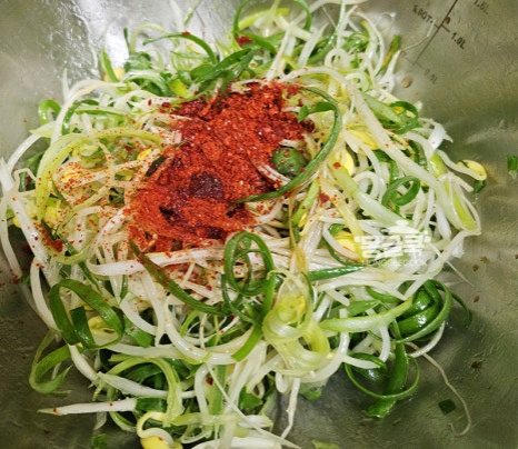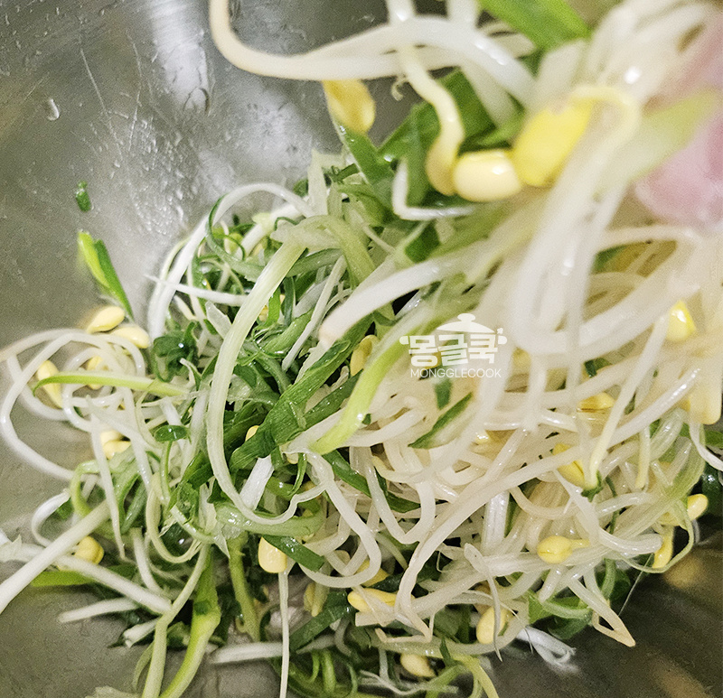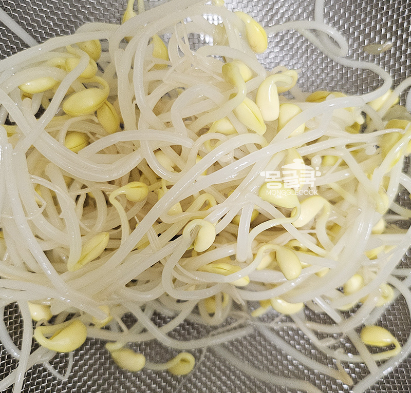 데친 콩나물은 즉시 찬물에 헹구어 열기를 빼주고, 체에 밭쳐 물기를 탁탁 털어 최대한 제거해 주세요.. 무침에서 물이 생기는 주요 원인이 바로 콩나물의 잔여 수분이기 때문에 여기도 꼭 신경 써주세요.
