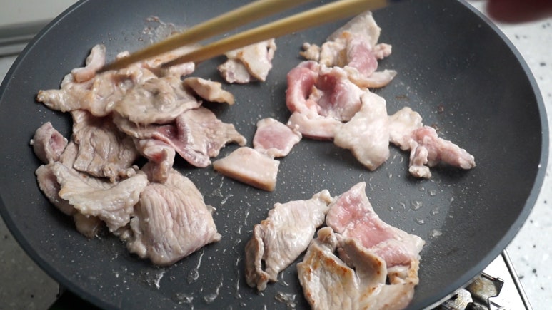 13. 돼지고기 앞다리살 제육용으로 얇은걸 강불로 달군 팬에 넣고 식용유를 추가해서 핏기없이 90% 정도 까지 익게 볶아주세요.