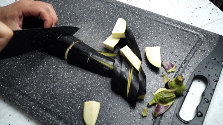 가지 1개를 세로로 반으로 자른 다음 길이는 3~4cm 두께는 2cm 정도로 썰어주세요.