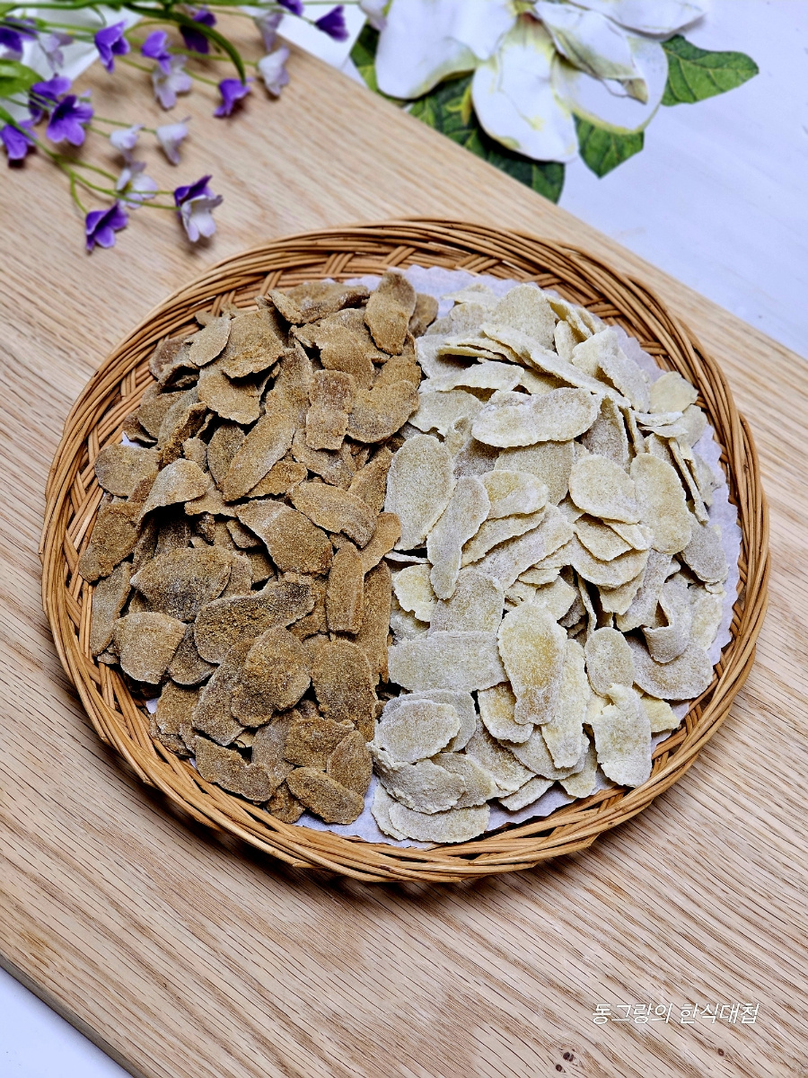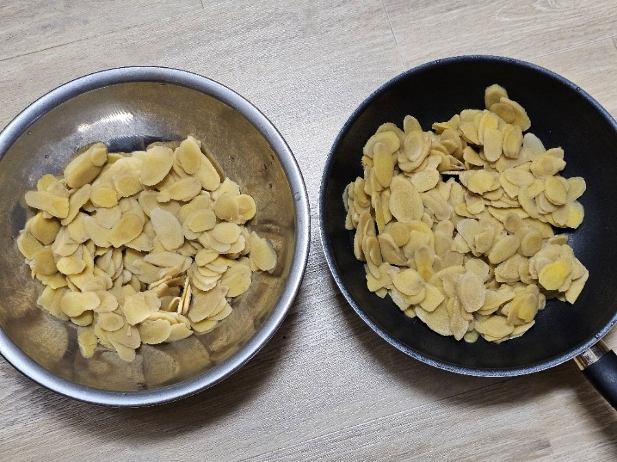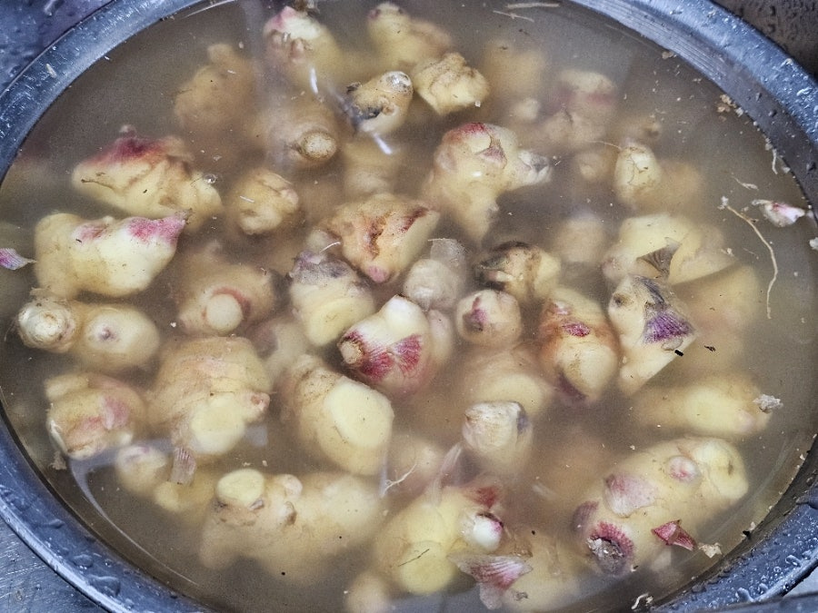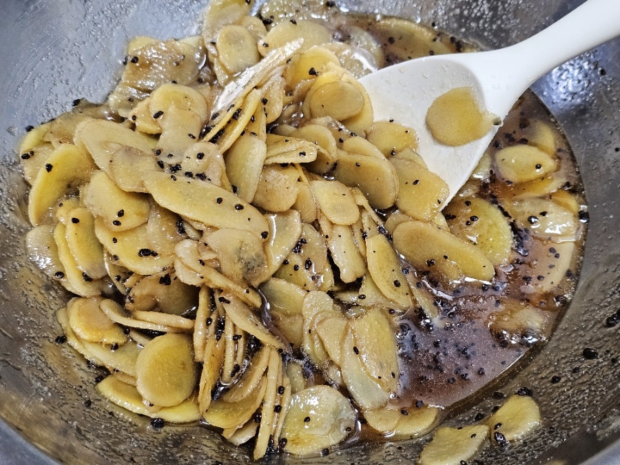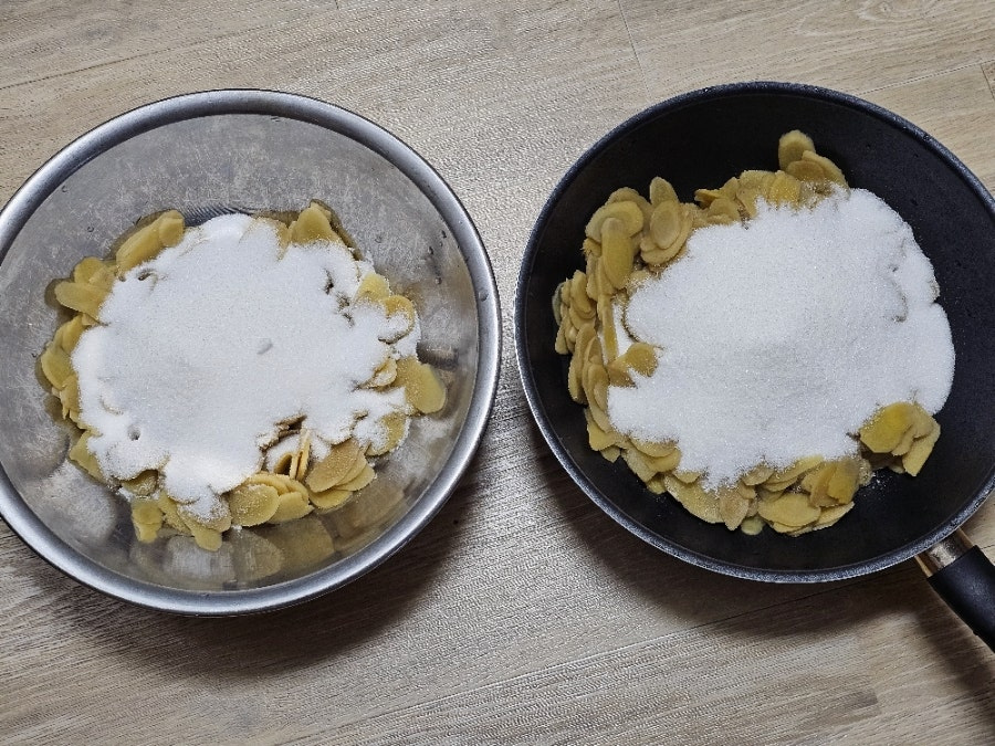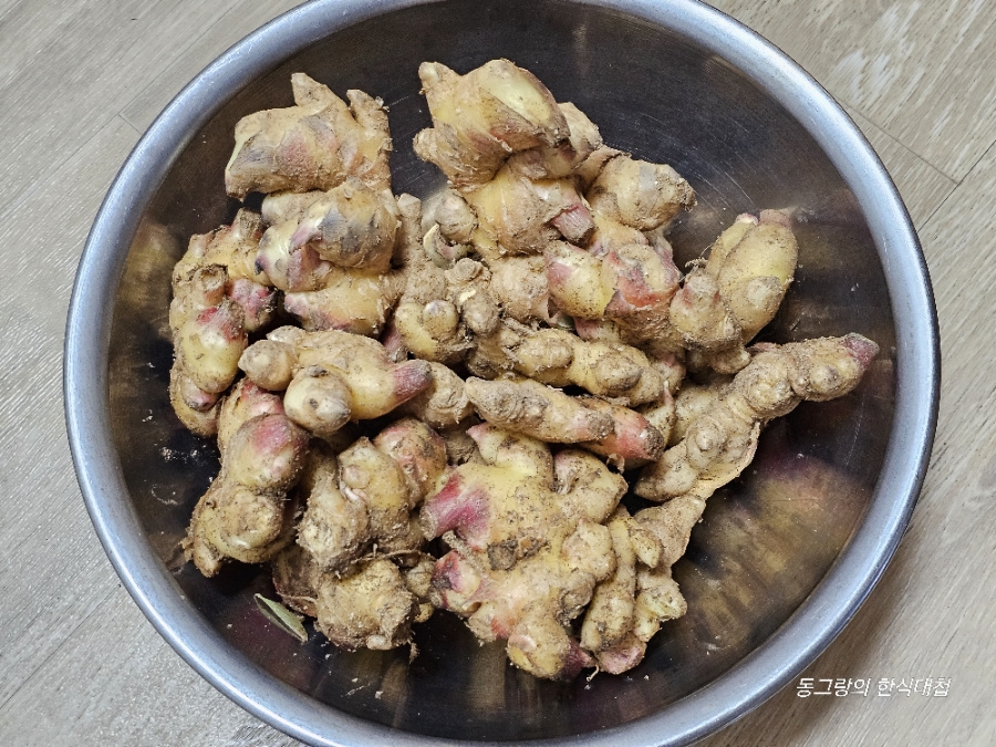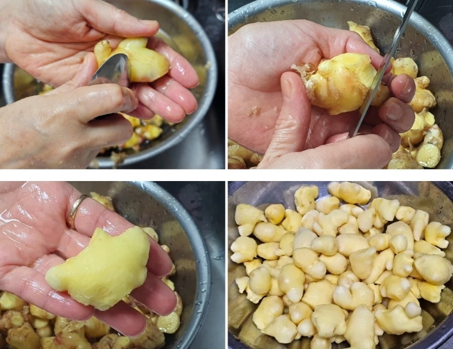 쉽게 생강 까는 법은 양파망에 넣고 바락바락 치대면 반 이상 껍질이 벗겨지는데 남은 껍질은 숟가락이나 칼로 정리하면 쉽게 깎을 수 있지요.