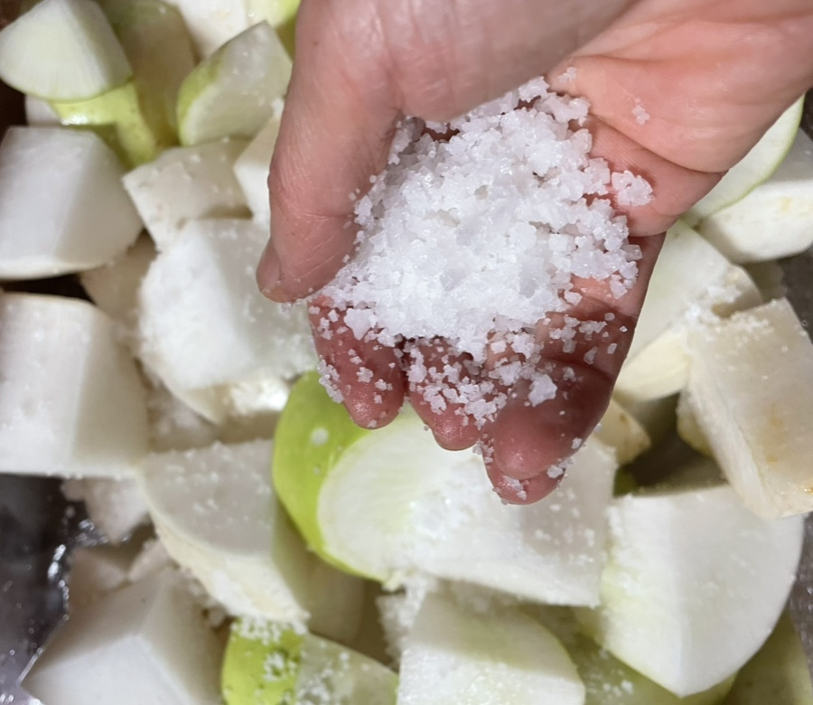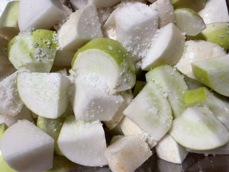 무에 천일염 1/2컵을 뿌려 잘 섞어 주고 1시간 정도 절여 주세요.