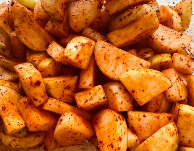 두께 2-3cm 정도로 썰어 반달 모양으로 썰거나 너무 크면 4등분으로 썰어 주세요.