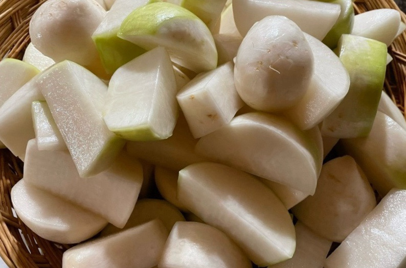 작년 김장철에 무를 큼직하게 썰어 석박지를 담으면서 안먹게 되서 남아있던 대봉시가 보이길래 그냥 시험삼아 넣고 담았었어요.