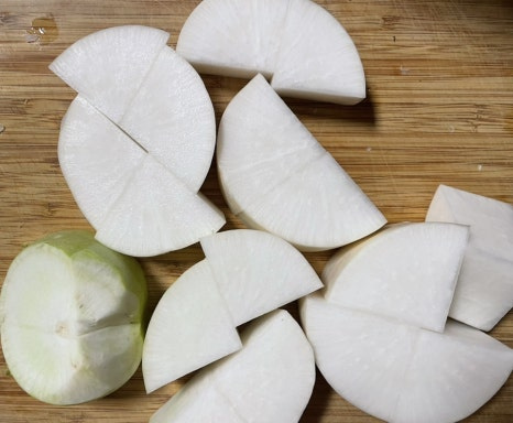 무를 씻어 주고 큼직하게 썰어 주세요.