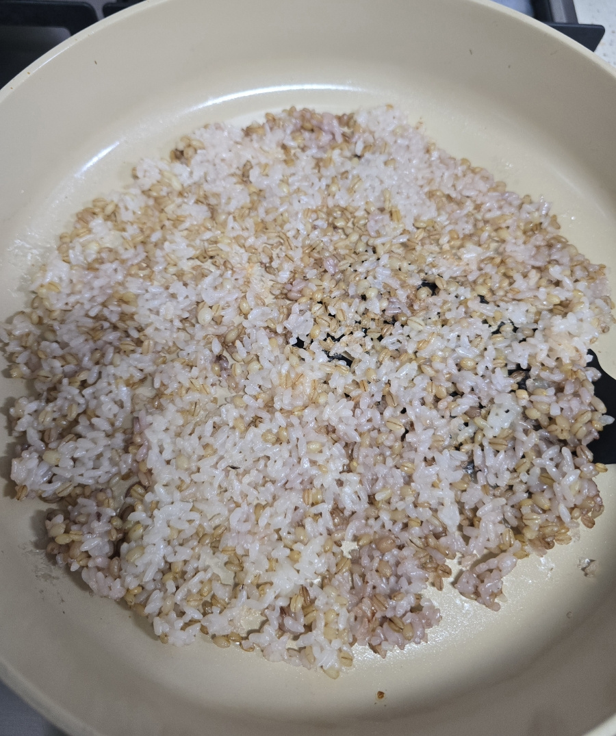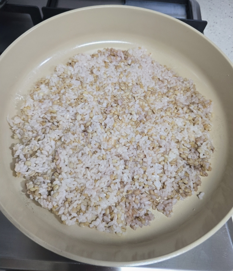 이 밥을 프라이팬에 얇게 펼치면 밥알 사이의 전분이 수분을 날리면서 아주 얇고 바삭하게 코팅이 되어요.