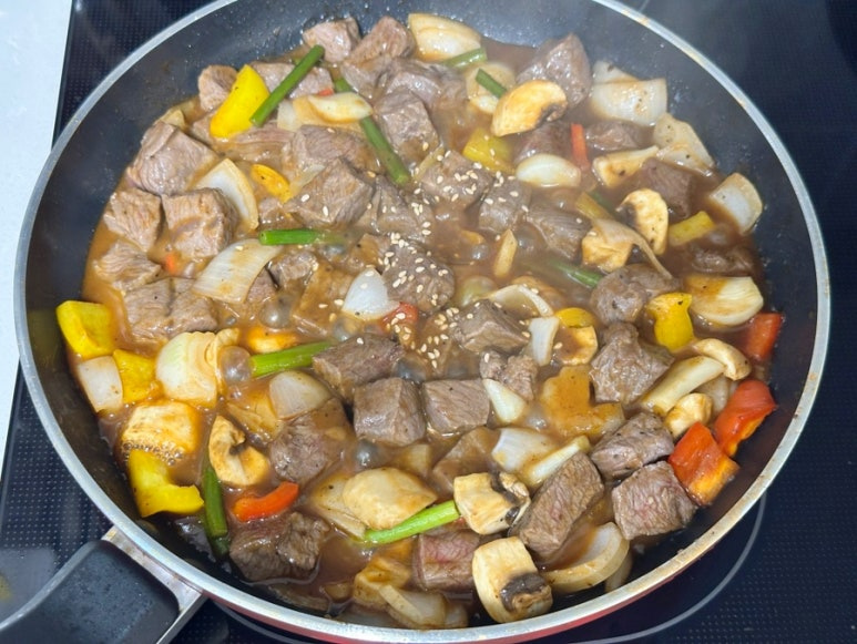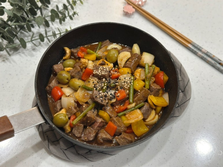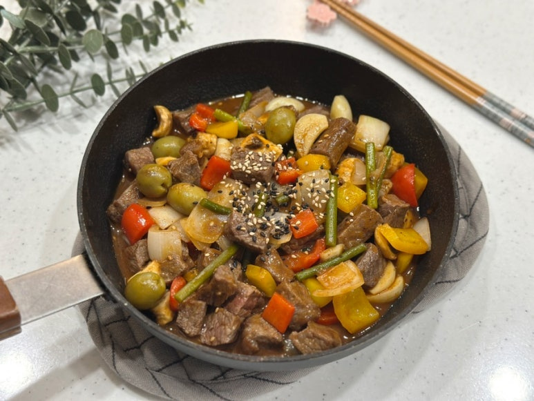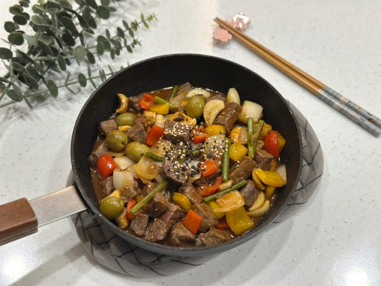 소고기 등심을 한 입 크기로 썰어서 야채들과 소스에 빠르게 볶아주면 맥주나 와인과도 어울리고 아이들도 밥반찬으로 맛있게 먹는 특별 메뉴가 된답니다. 시원한 에어컨 바람을 쐬면서더위도 식히고 맛있는 음식을 먹으면 딱 홈캉스인것 같아요ㅎㅎ 소고기 등심으로 집에서도 근사하고 맛있게 즐길 수 있는 찹스테이크를 만들어 보도록 할게요 :)