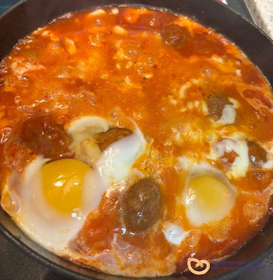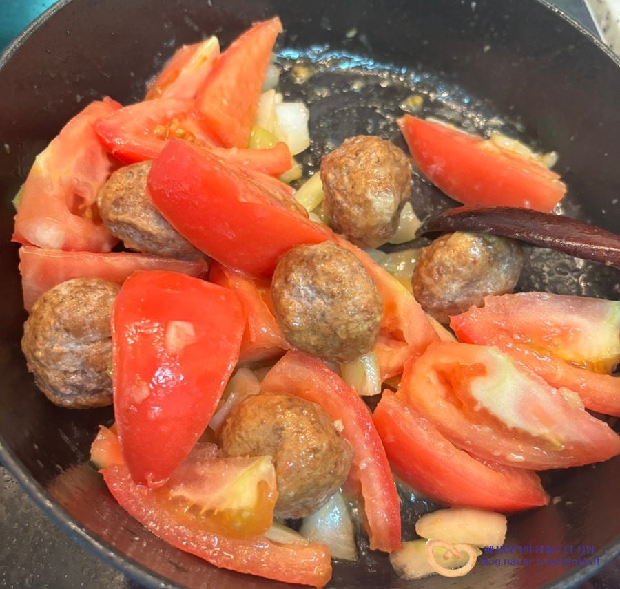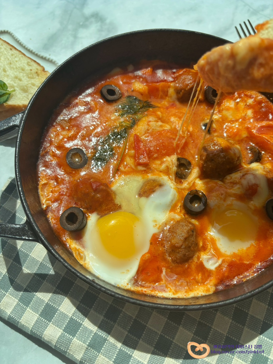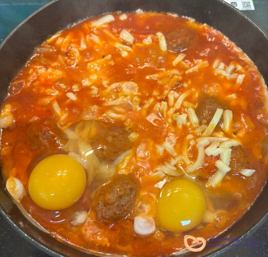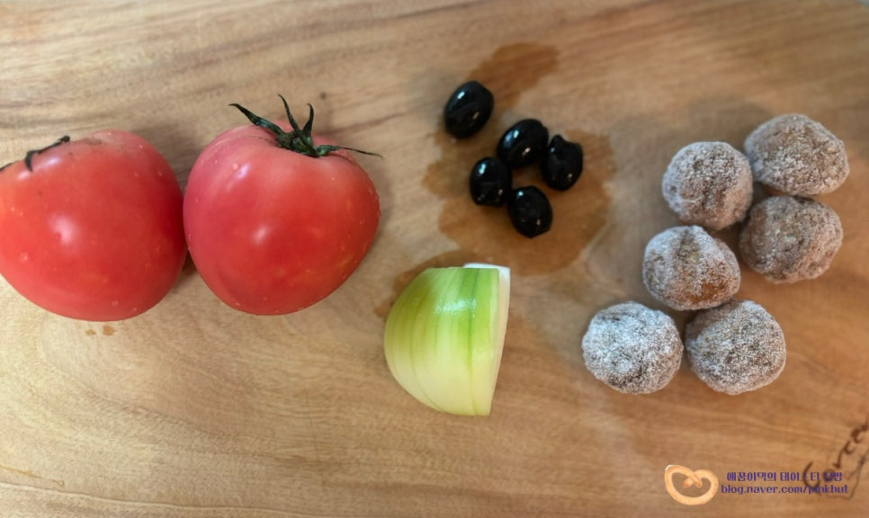토마토 2개 , 양파 1/4개 , 냉동 미트볼 6개 (생략 가능), 올리브 5개 , 계란 2개 , 모짜렐라치즈 듬뿍
