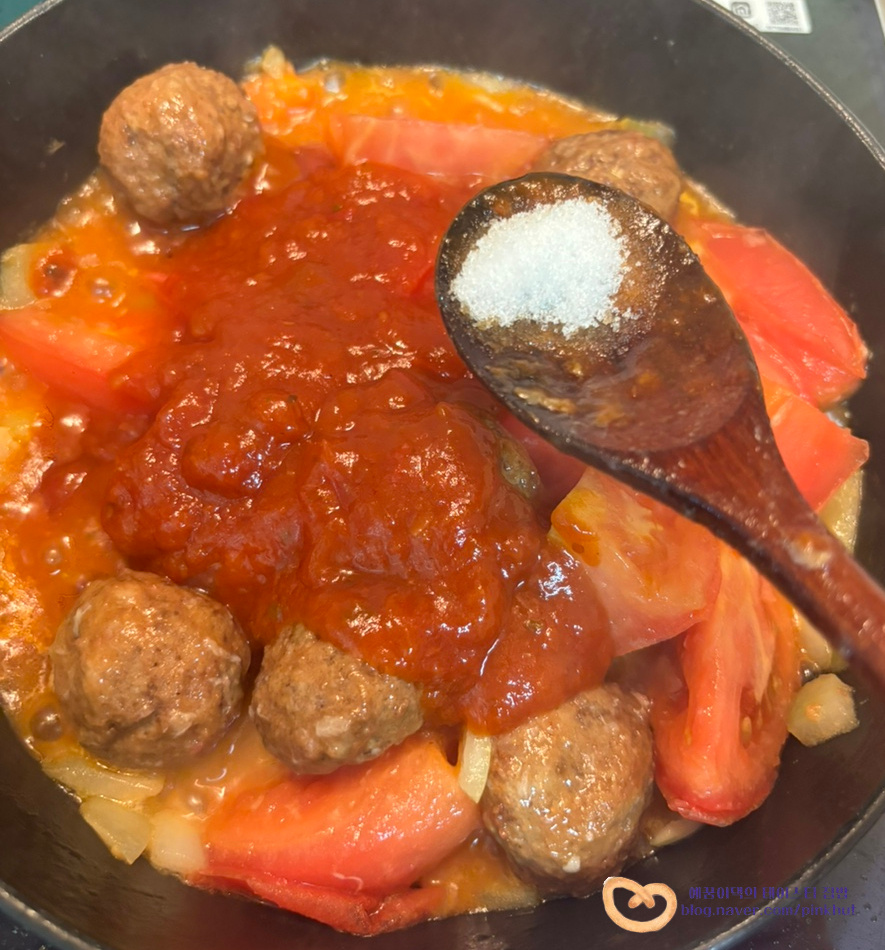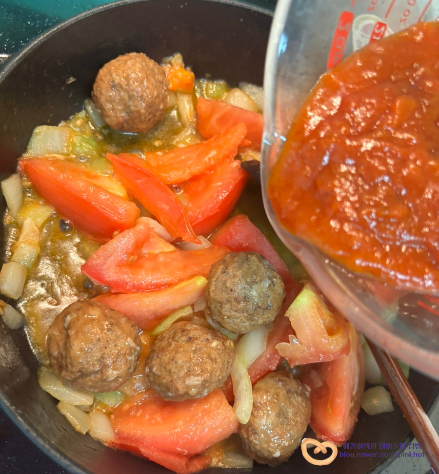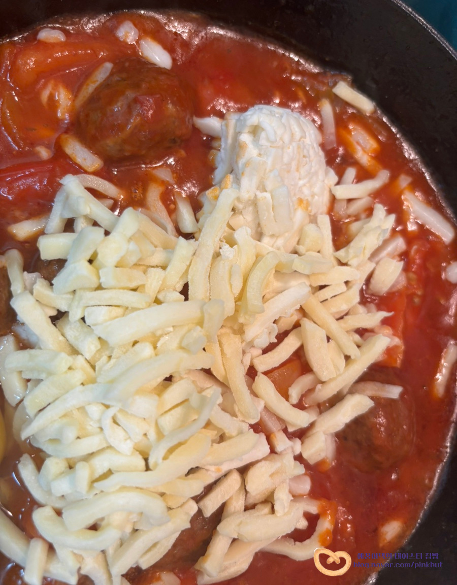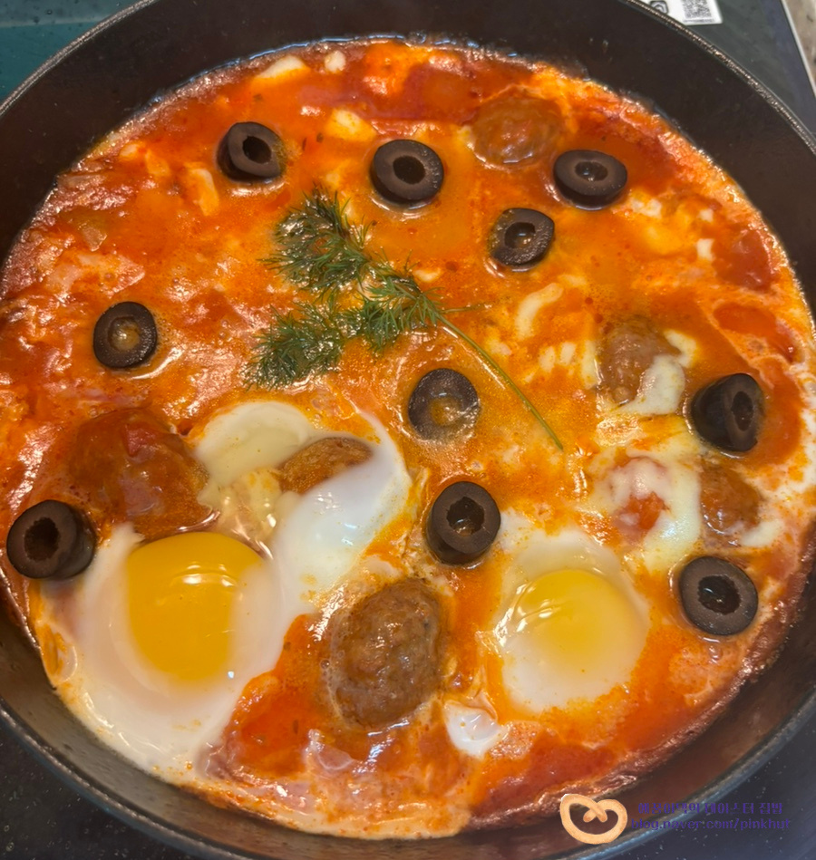 토마토 2개 , 양파 1/4개 , 냉동 미트볼 6개 (생략 가능), 올리브 5개 , 계란 2개 , 모짜렐라치즈 듬뿍