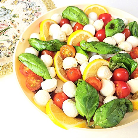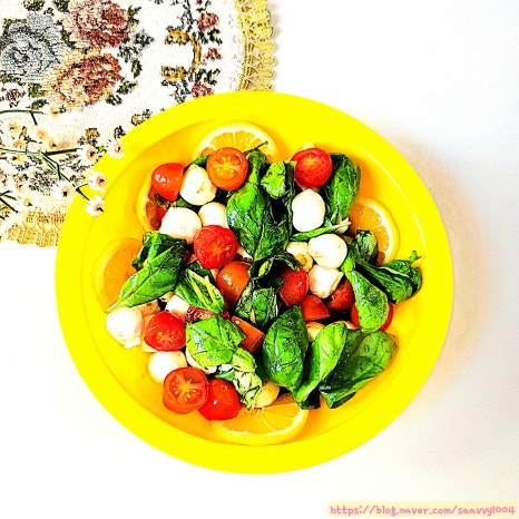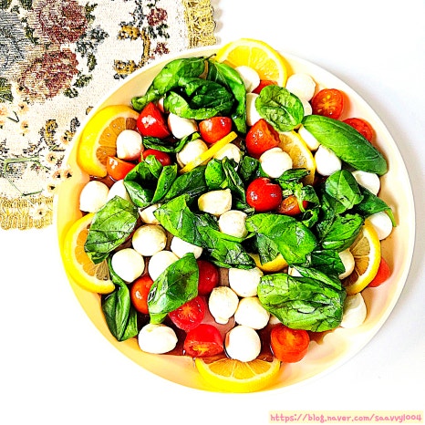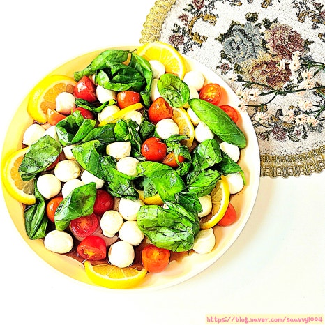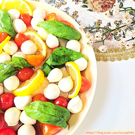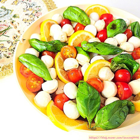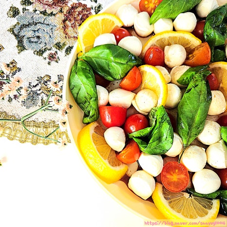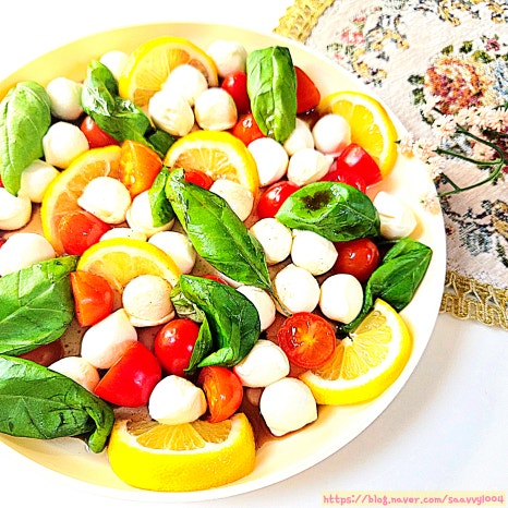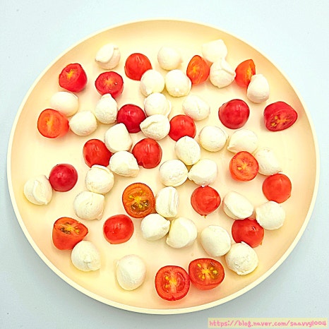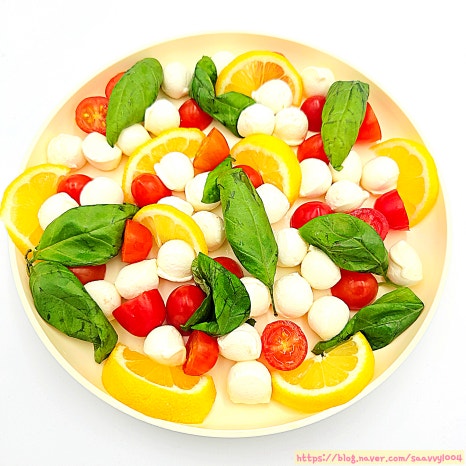 생모짜렐라 꽃 카프레제 완숙 토마토와 생 모짜렐라를 최대한 얇게 썰어 꽃 모양으로 만들면 무척 좋은 초...