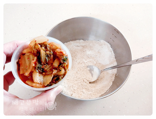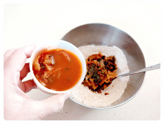 반죽에 물 없이 잘게 자른 묵은 김치와 김치 국물