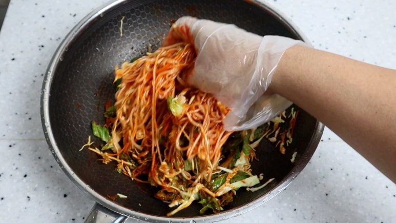 19. 젓가락으로 비비셔도 되지만 이렇게 손으로 살짝살짝 힘주어 눌러가며 비벼주면 양념이 국수에 더 맛있게 달라붙더라고요. 그래서 저는 주로 손으로 비벼서 그릇에 담는걸 선호하는 편이에요.