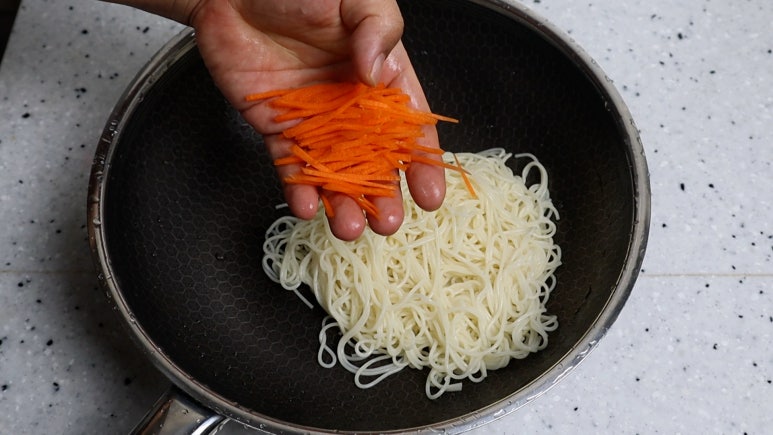 14. 기호에 따라 당근 1줌을 채썰어 넣어주세요