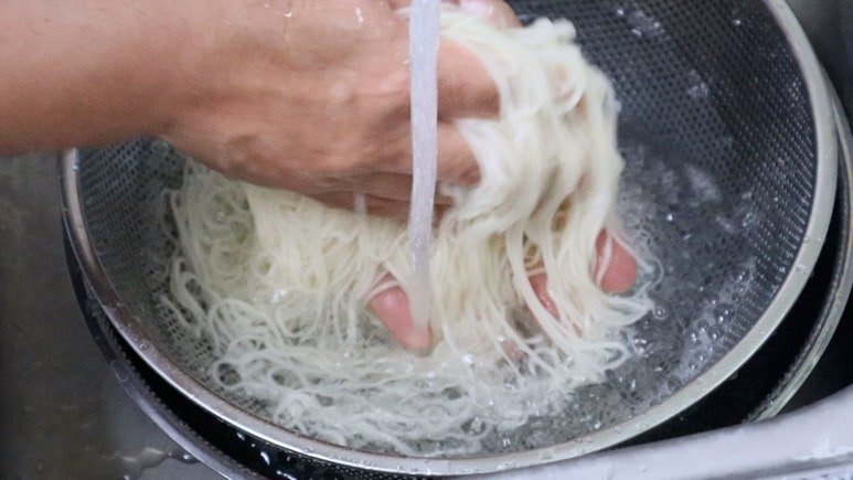13. 국수 1인분 삶아서 찬물 넉넉하게 받아서 2~3차례 뽀독뽀독 씻어주세요.
