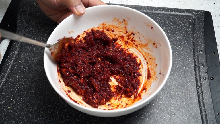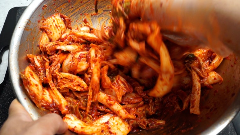 16. 물기뺀 배추에 양념을 우선 90%만 넣어서 버물버물 버무려주세요. 맛을 보시고 양념이 모자라면 남은 양념도 다 넣어주세요.