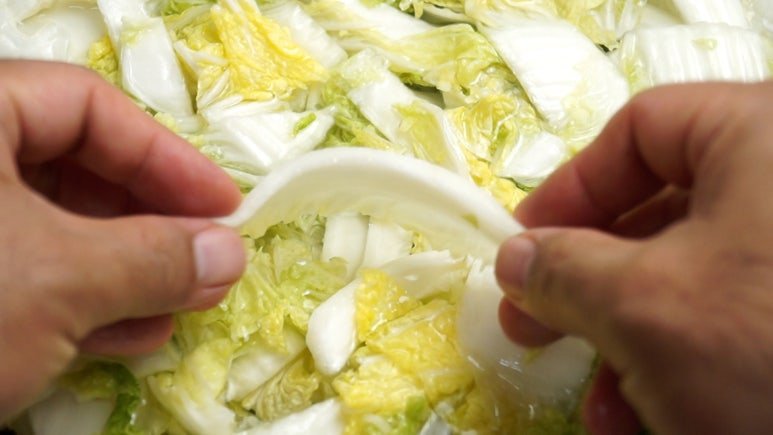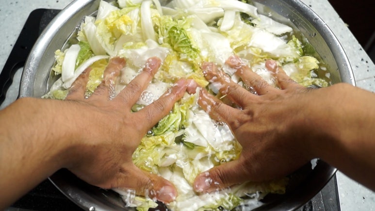 5. 손으로 구부려도 배추대 부분이 부러지지 않고 휠 정도로 절여 쳤으면 잘 절여 진거에요.