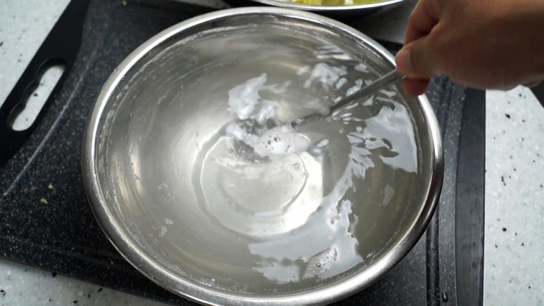 3. 배추절이기 란에 물과 소금을 볼에 넣어주시고 골고루 저어서 소금을 완전히 녹여주세요.