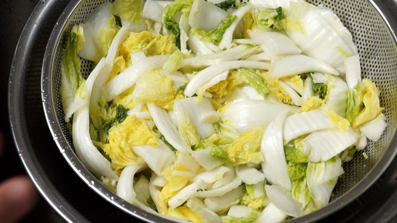 6. 배추를 물을 넉넉하게 받아서 2~3차례 헹궈 준다음 채반에 올려 30~40분 정도 물기를 빼주세요.