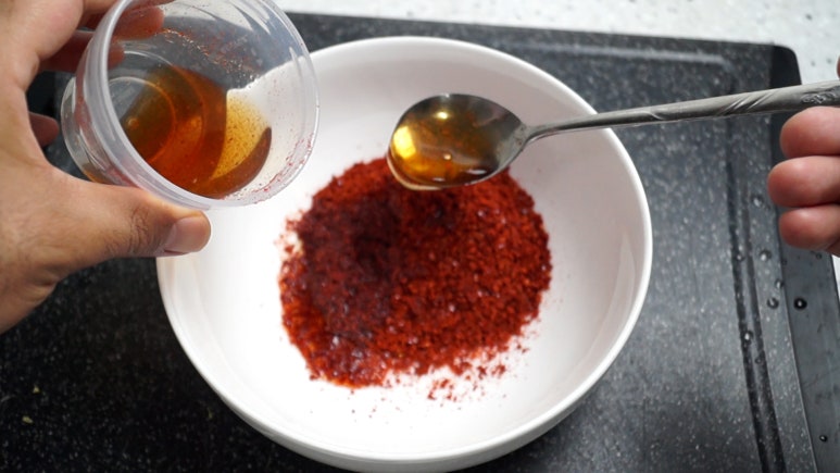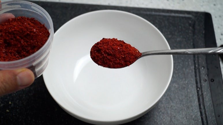 7. 볼에 양념란에 적힌 고춧가루를 넣어주세요. 중간입자 고춧가루 사용했습니다.