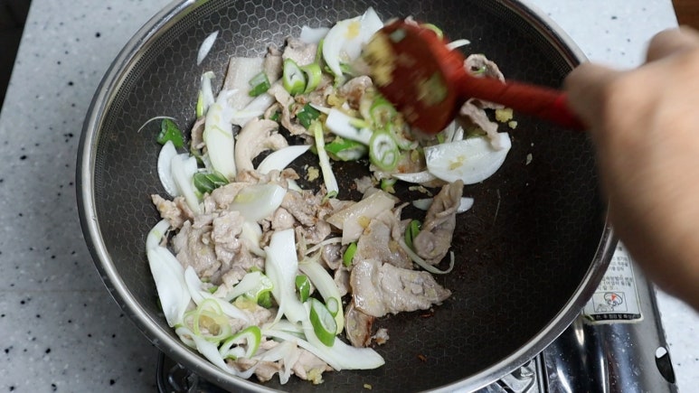 16. 대파 양파를 넣고 강불에 1분 30초 정도 볶아주세요. 고기 많이 드시고 싶으시면 고기 양을 2배로 늘여주세요.