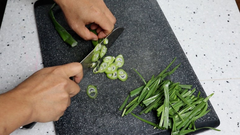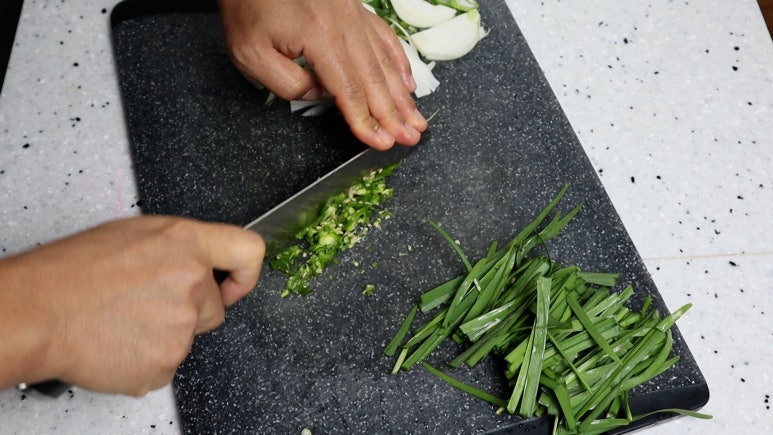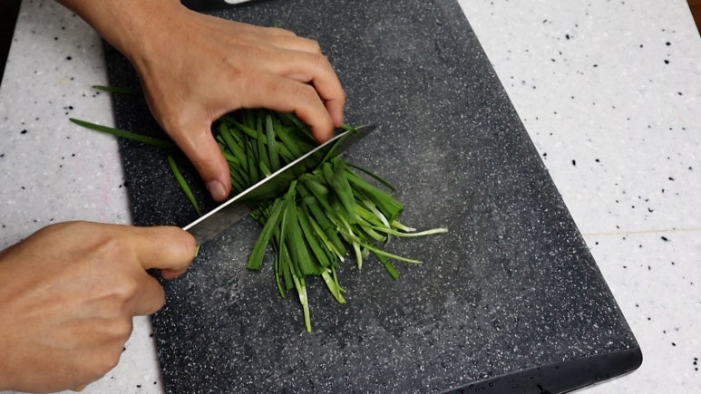 부추 1~2줌 정도를 4~5cm 로 썰어주세요. 부추 좋아하시면 2배로 준비하셔도 좋습니다.