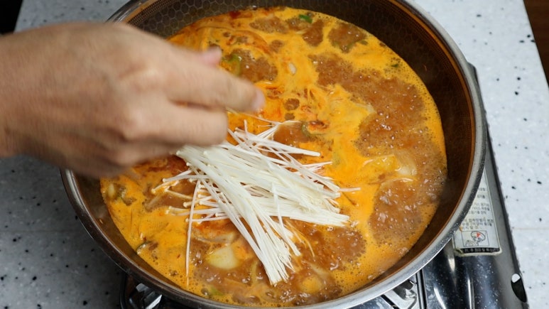 21. 생략해도 되는 팽이버섯을 찢어서 넣어주세요.