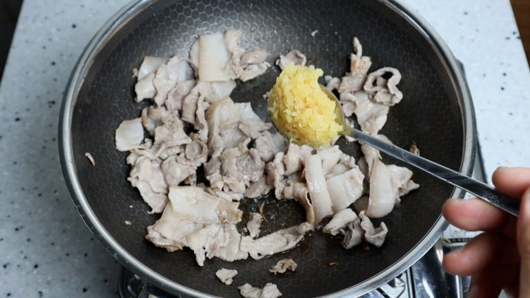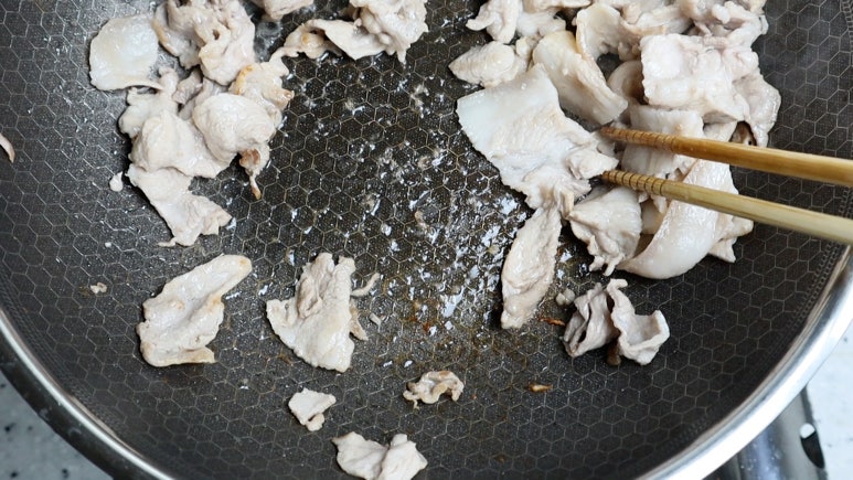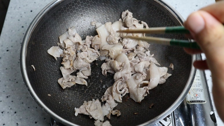 13. 기름기가 적당히 있는 돼지고기 앞다리살 불고기 감으로 강불에 2~3분 바짝 볶아주세요.