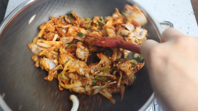 17. 양념을 우선 90% 만 넣고 30~40초간 강불에 볶아주세요.