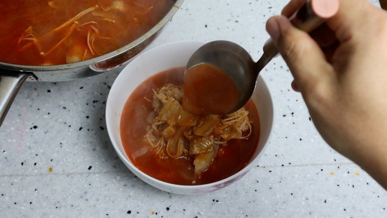 23. 밥을 퍼고 그 위로 국물과 건더기를 넉넉하게 끼얹어주세요.
