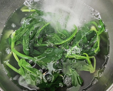 잎 부분을 넣어 전체 30~40초 이내로 짧게 데쳐주세요.