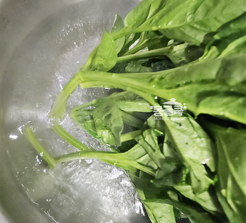 데친 시금치는 바로 찬물에 넣어 열기를 빼주면 더욱 아삭한 식감을 유지할 수 있어요.