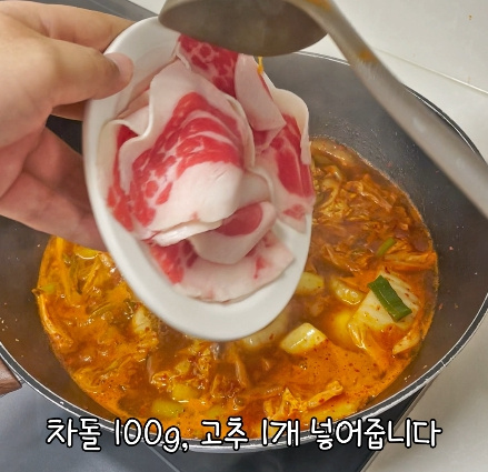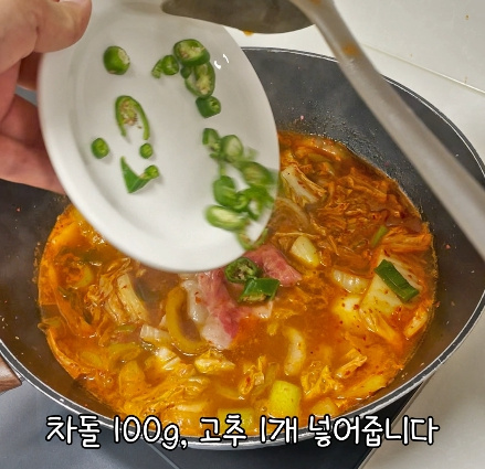 차돌 한 줌과 청양고추 1개를 넣고 차돌이 익을 때까지 끓입니다.