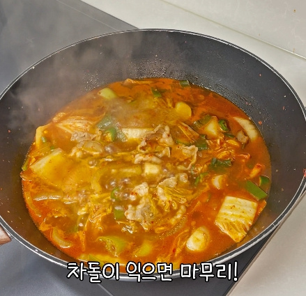 불을 너무 세게 하면 차돌이 질겨질 수 있으니 중불 유지가 좋아요.