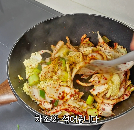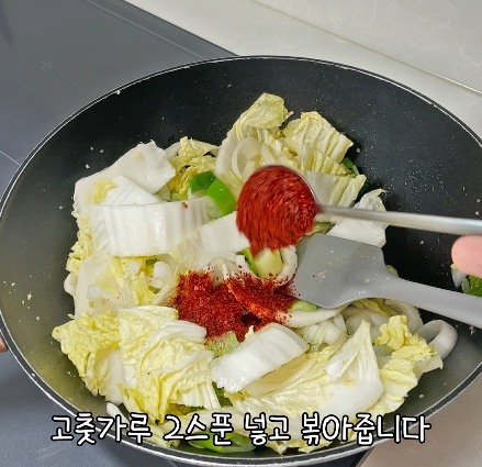 알배추와 양파를 넣고 볶다가 고춧가루 2스푼을 넣어 불맛을 내듯 볶습니다.